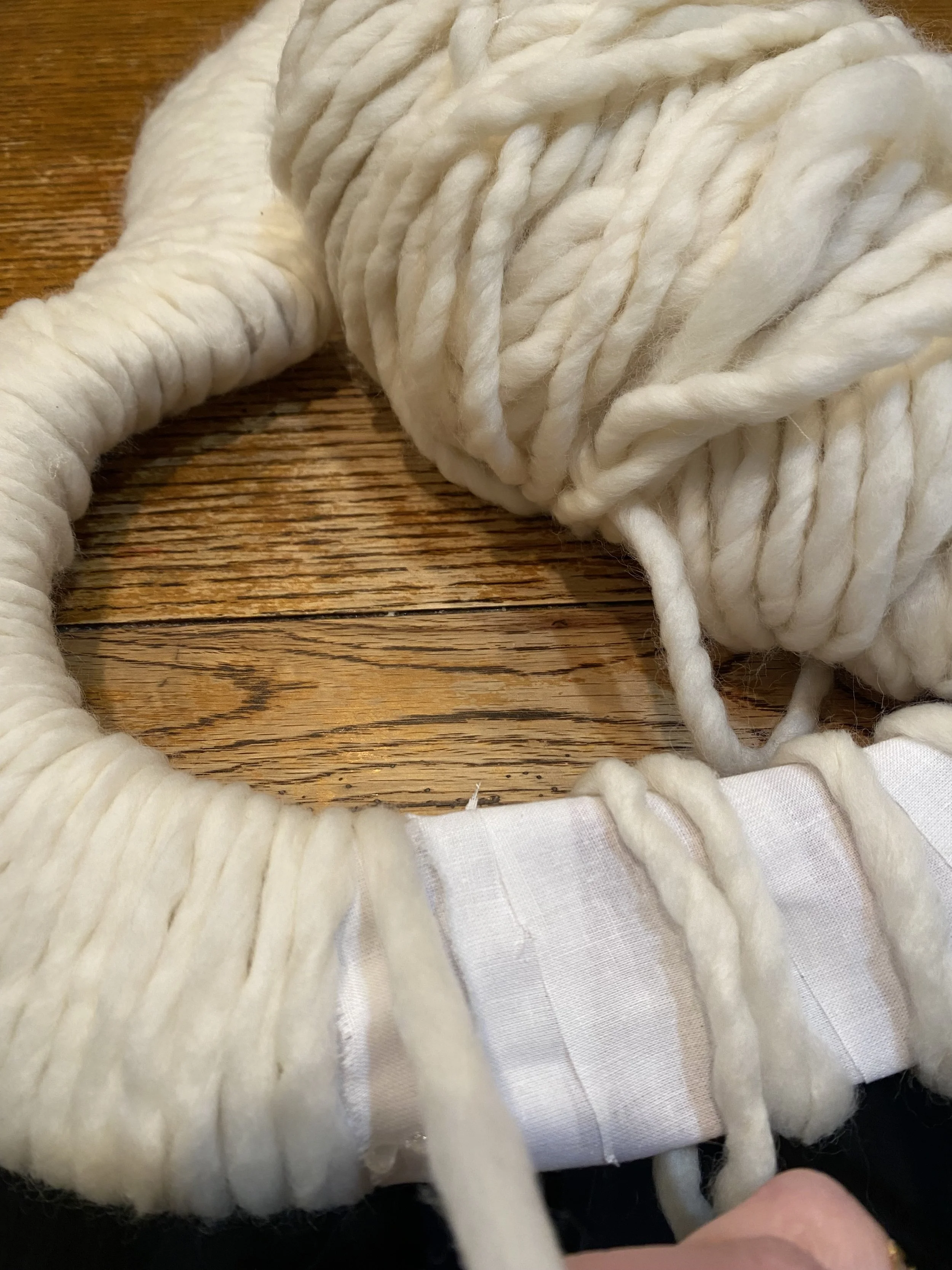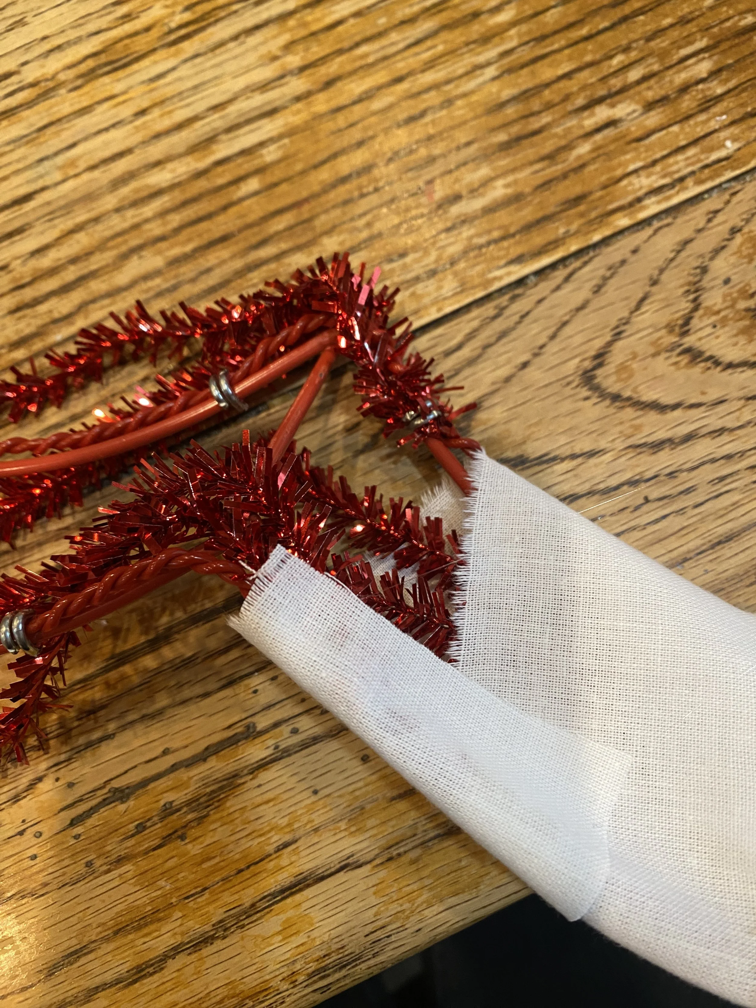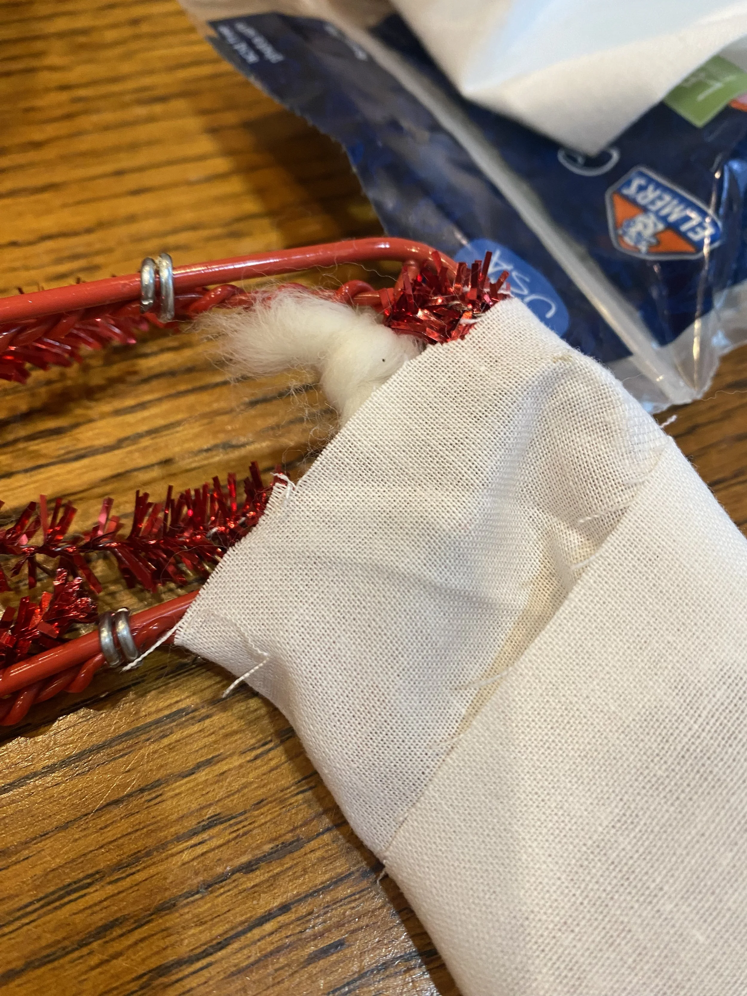 I started wrapping the yarn and realized that the red wire glittery things were going to poke through, so I grabbed some scrap fabric that matches my yarn and my trusty glue gun and wrapped, and glued, the frame with white fabric. It pays to keep those bigger fabric scraps, even though the hubby would heartily disagree.