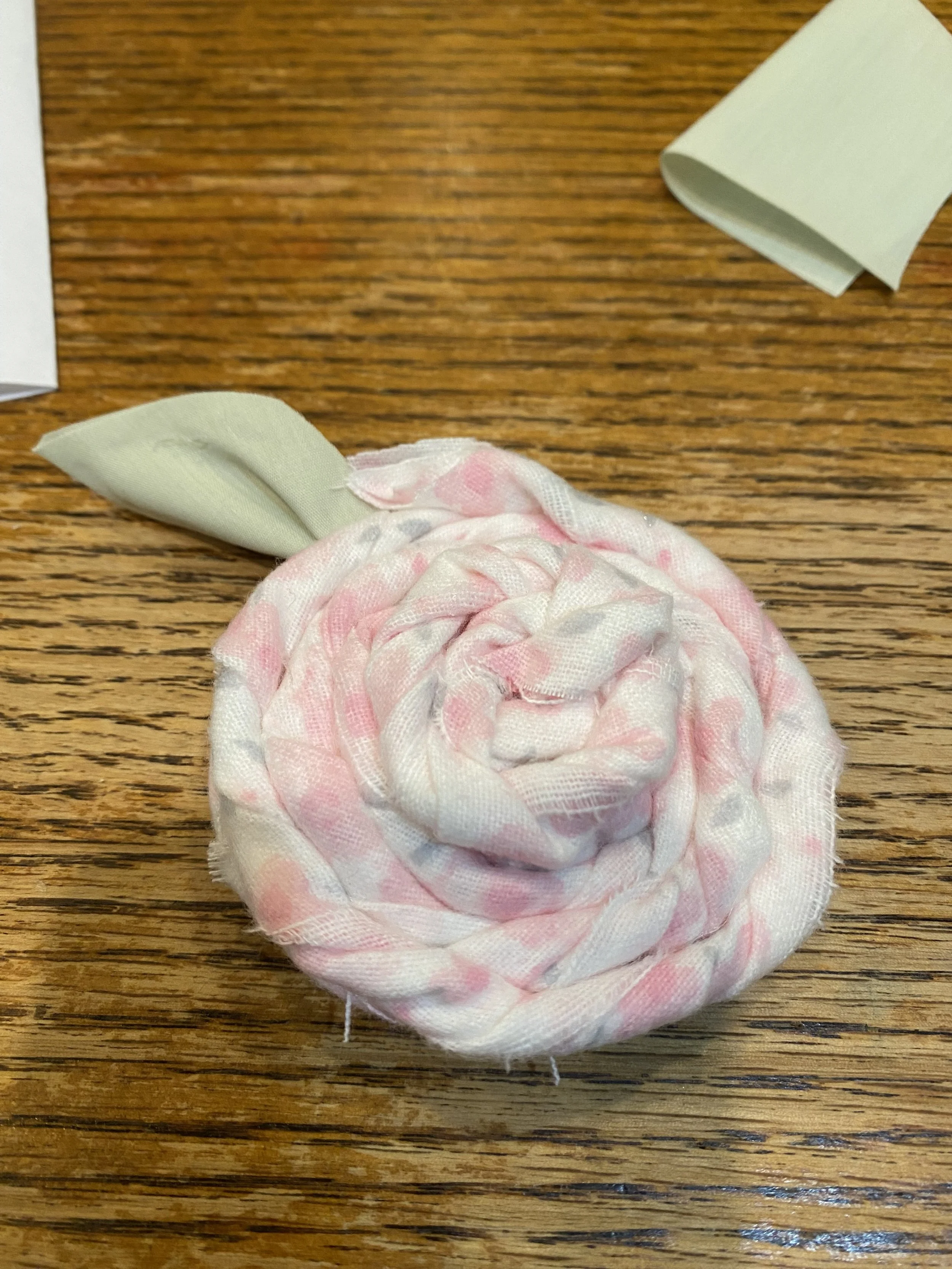 Now for making the fabric flowers. I don’t have good pictures of the process, but basically you twist strips of fabric, about 1 1/2” by 10 - 12” and then curl them into a round shape and hot glue them as you go. Longer strips will make bigger flowers. (You could cut a piece of paper or cardstock slightly smaller that the size you want and glue your twisted strips to it, to help form it, if you want.) I used flannel fabric to go with the cozy look.