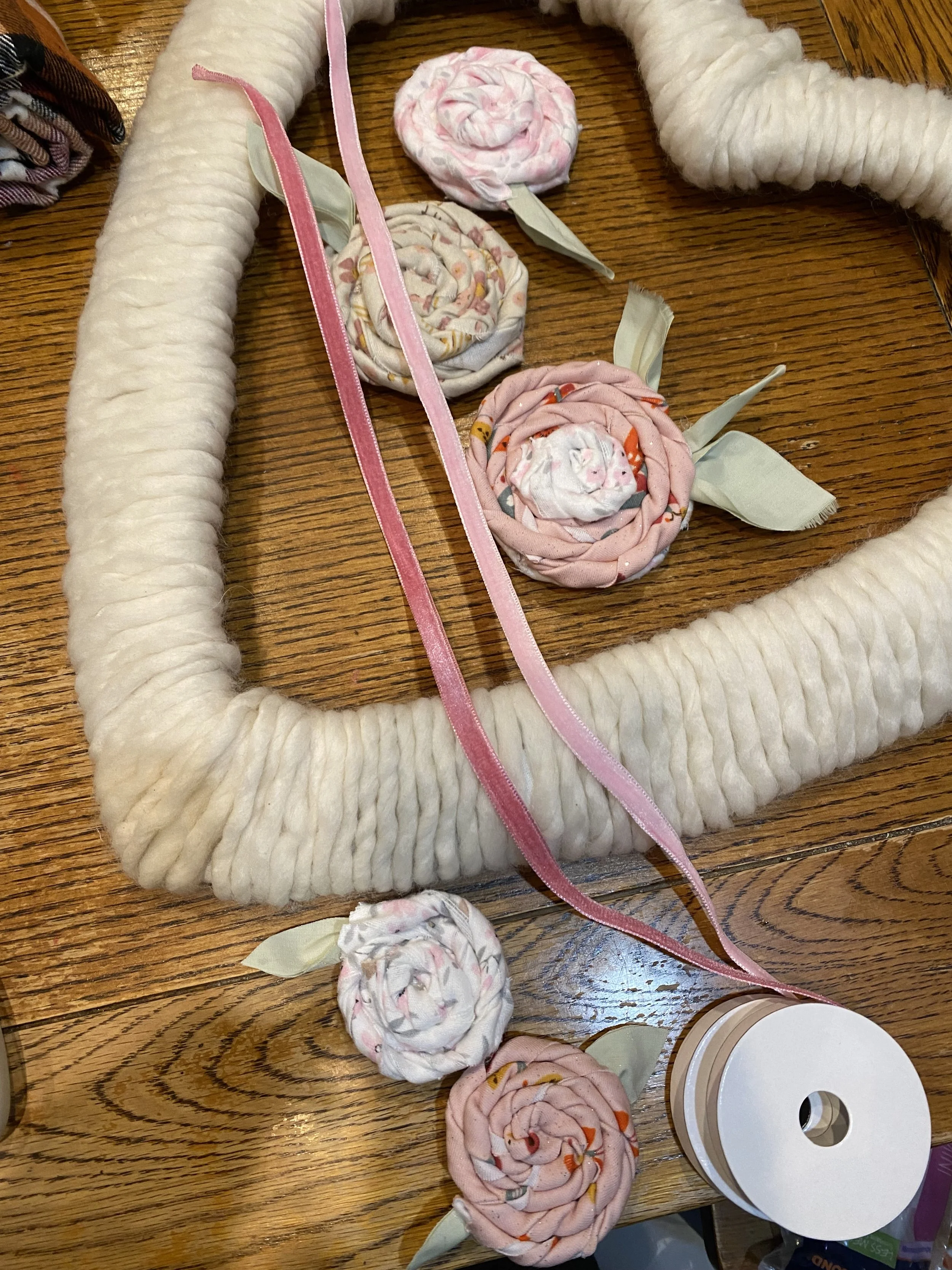 You can glue your flowers to the wreath, but I wanted more drama, (I’ve been accused of being a maximalist, but I take no offense to truth, lol) so mine are going to hang. I found this cute little velvet ribbon and a pompom type trim that I’m going to use. Also, my door is 8 feet, so for scale, I need a longer door hanging. If you have a standard door, or one with a window, you won’t need it this long/big.