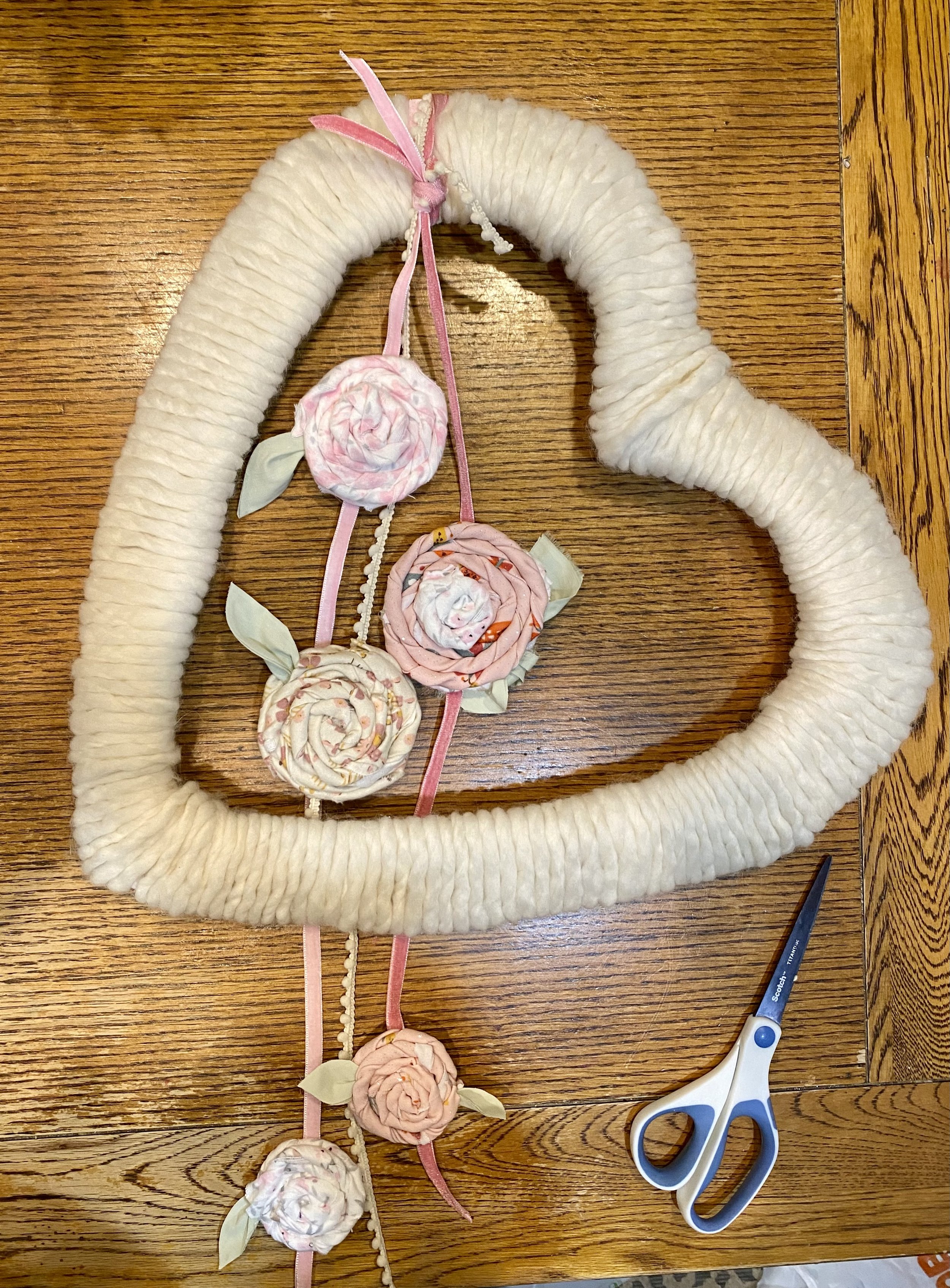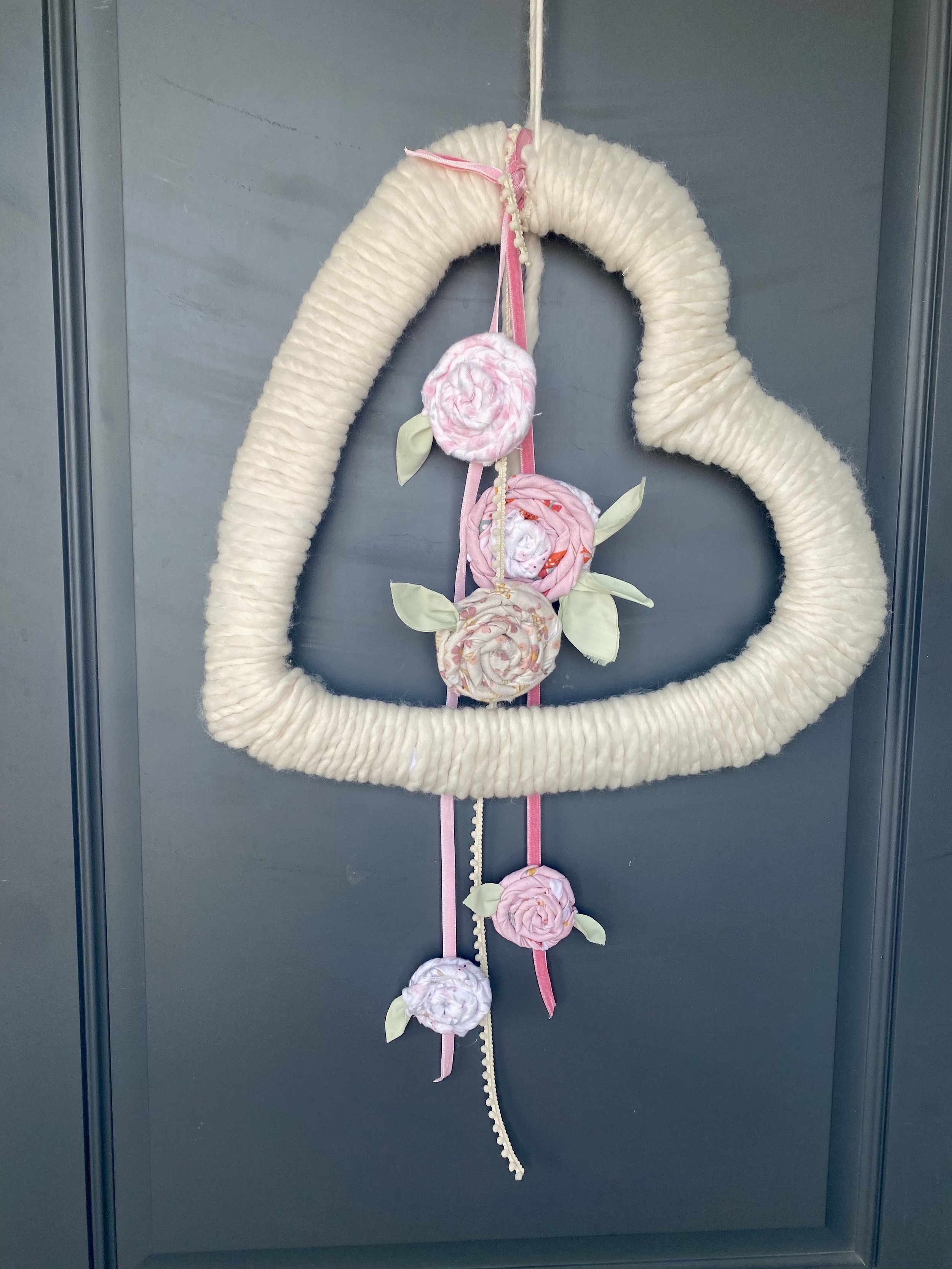 Where I live, we still have a lot of winter left when Valentines rolls around, and I came across this idea from Angie at Post Cards from the Ridge and it was perfect for me! It’s made with a fuzzy and cozy yarn and fabric flowers and is just so cute. Let’s get into the DIY of it!