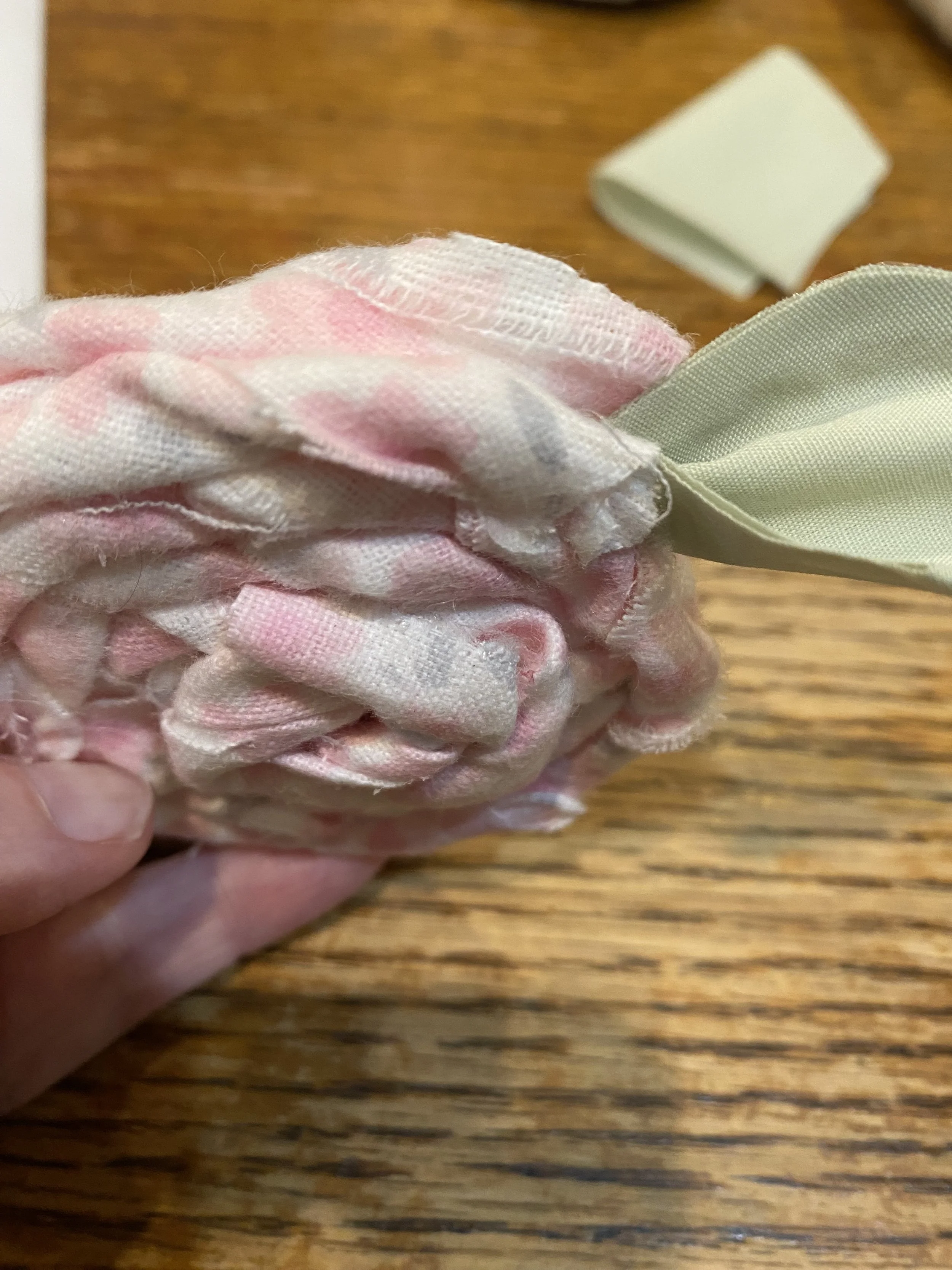 You can see my yarn knot where I had previously started, I kept that and started the wrapping at that spot so I could continue the yarn when I finished the fabric part. I only hot glued the fabric every 3 - 4 inches or so.