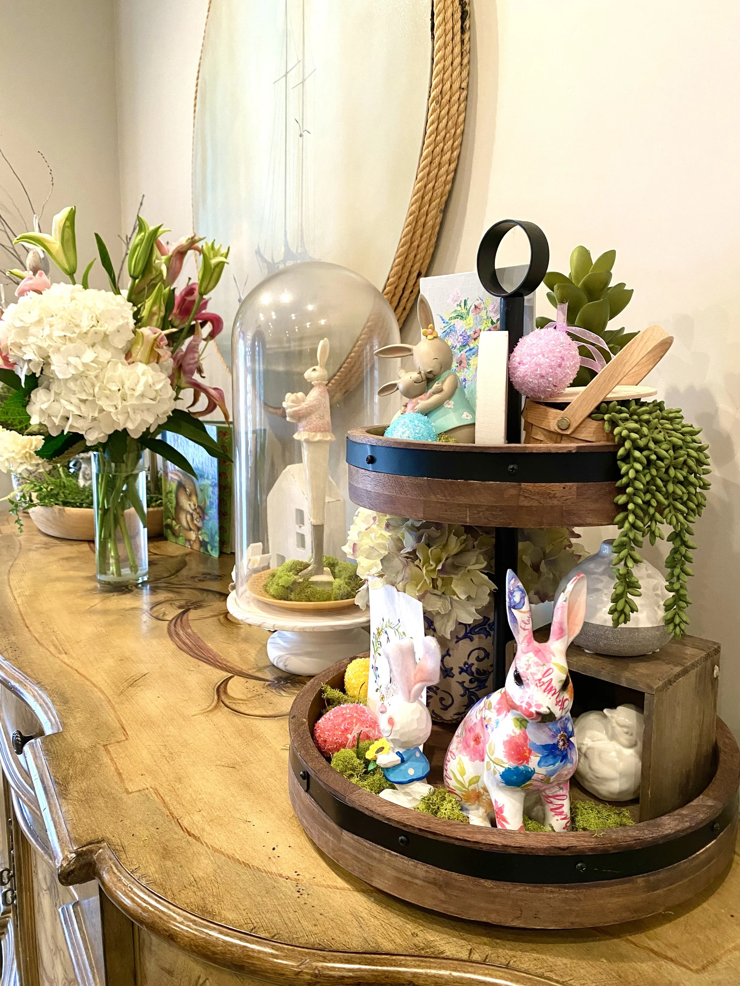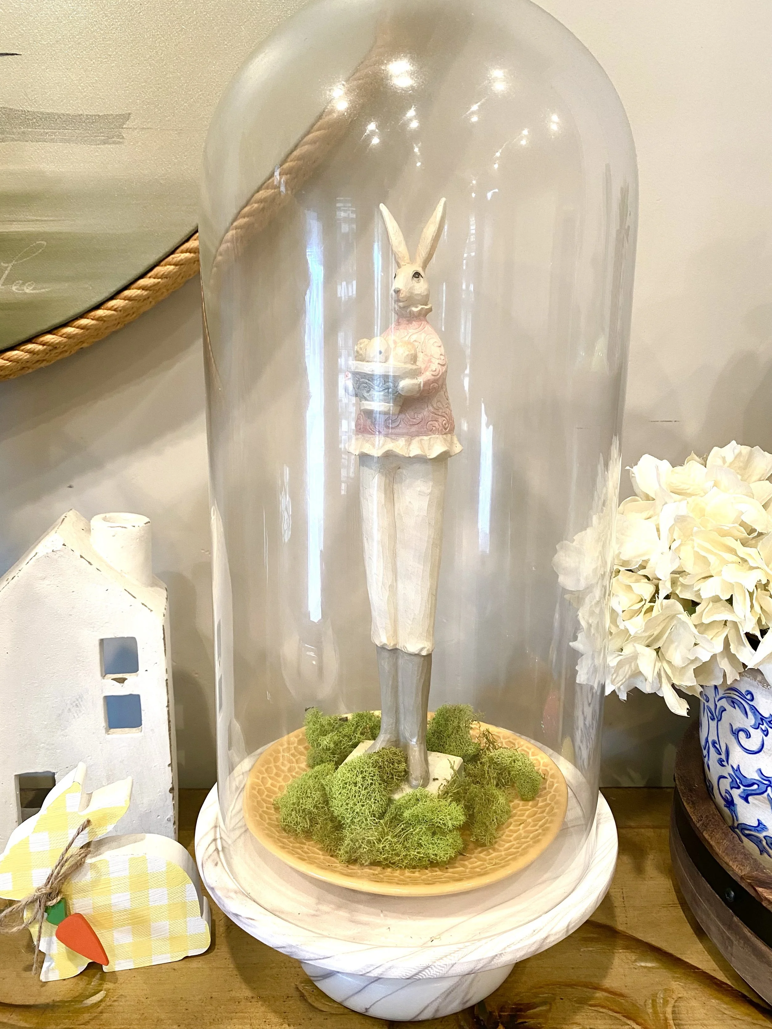 On the other side of the flowers, I have this very tall glass dome (it’s very hard to find a place to store it, so I have to use it all the time, lol) but this tall skinny bunny was perfect for it. I added the yellow plate to match the little wooden bunny next to it.