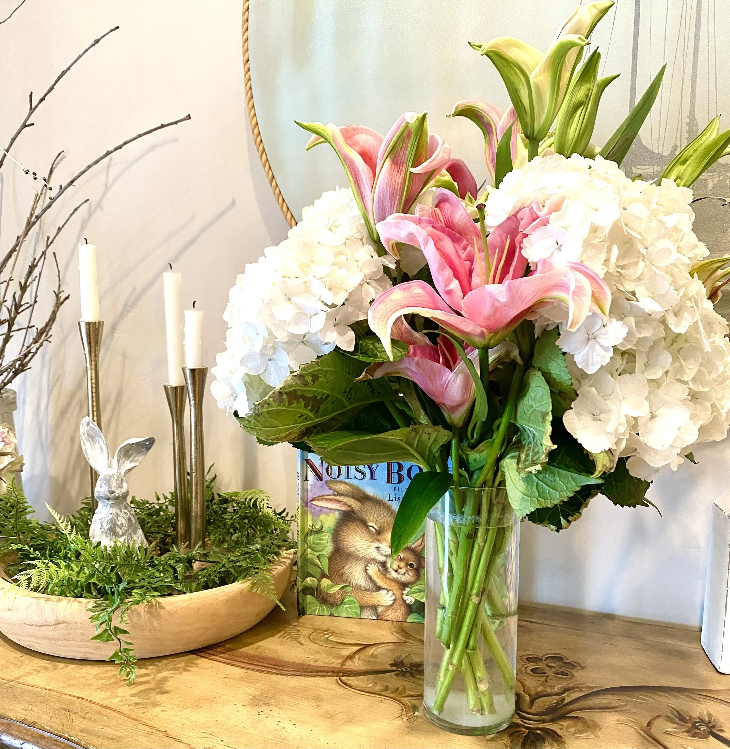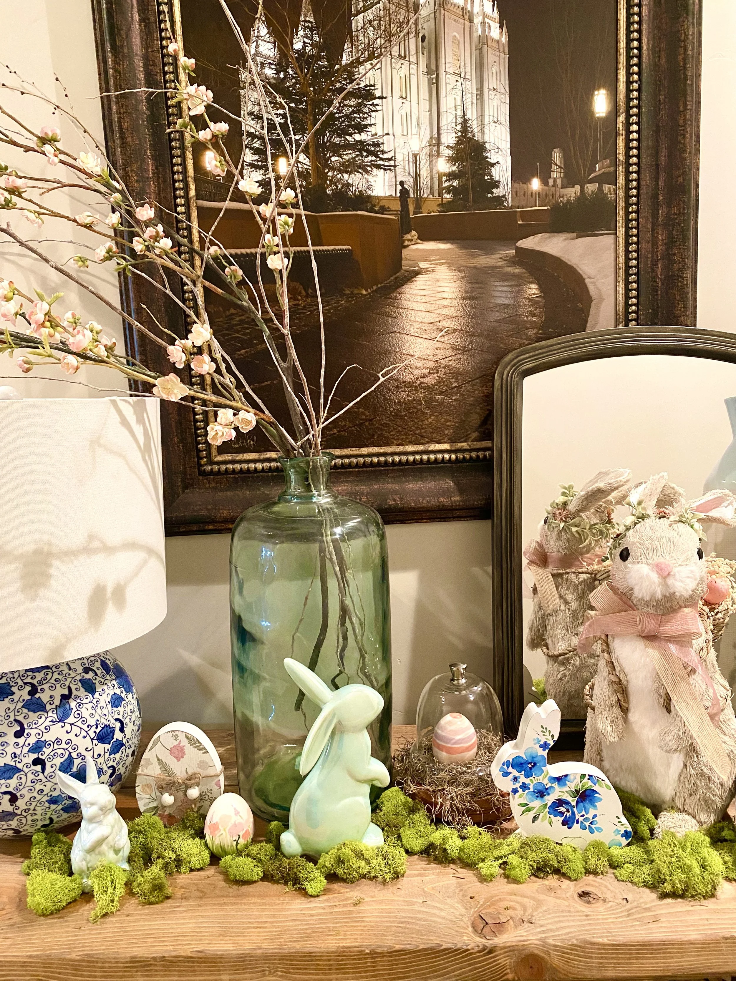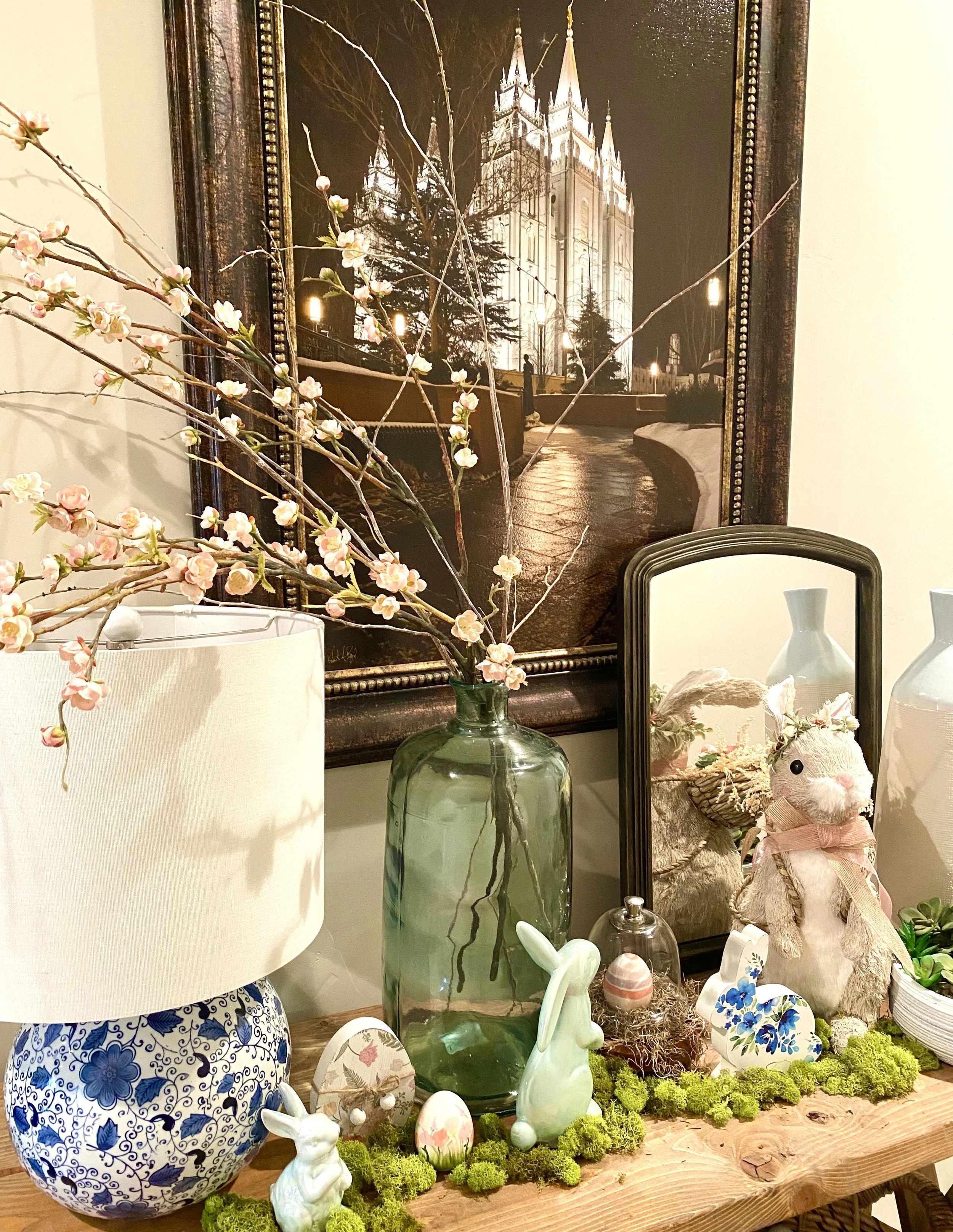 I also did my entry hall table. The white bunny on the left came from the thrift store. It was painted to look like a real rabbit, but badly, like, l could see where they were going with it, but yikes, so it got some white spray paint and now it’s so adorable!