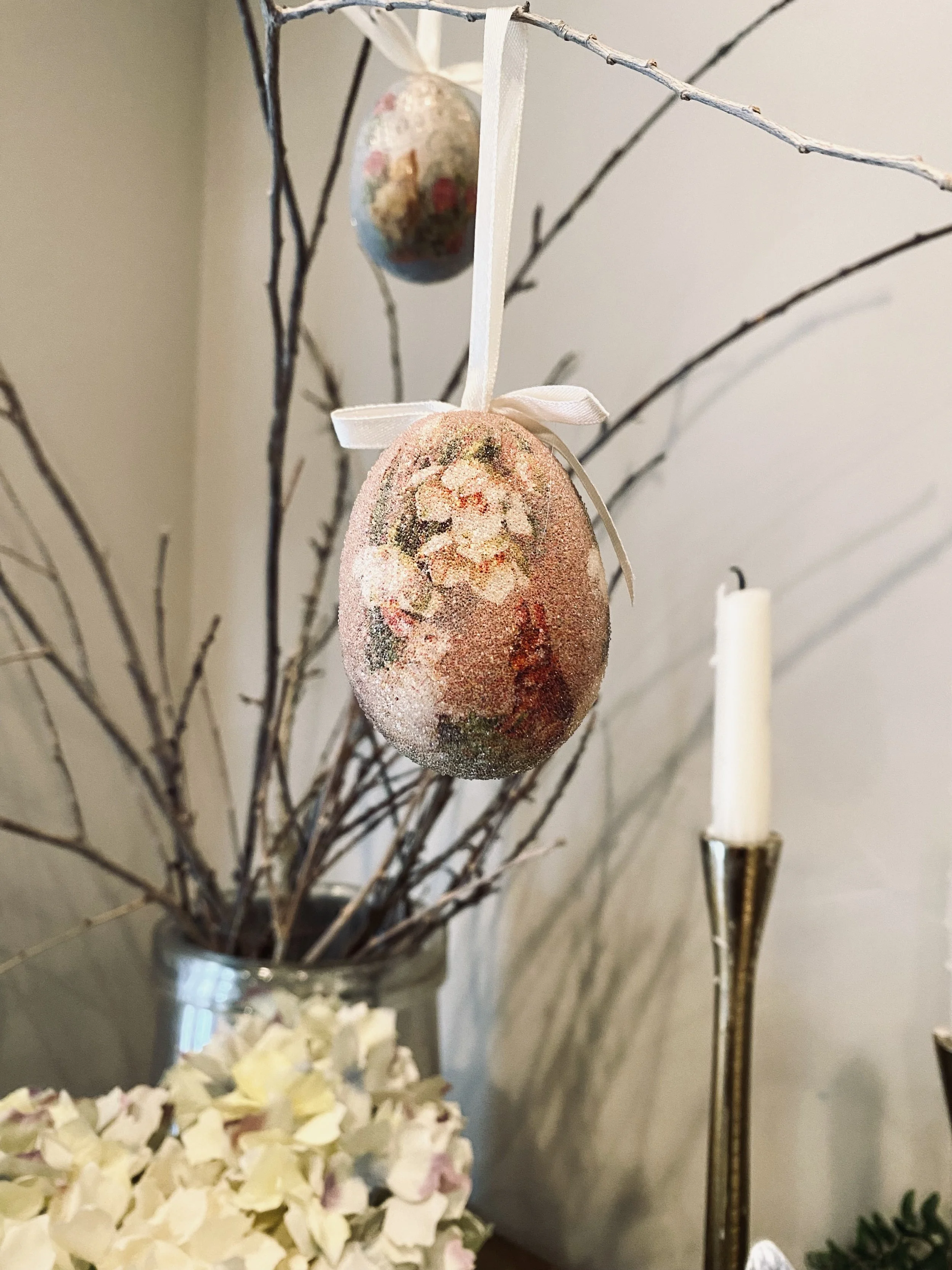 A few years back, Hob Lob had these stinking cute eggs, I love the vintage look of them. They ended up looking all pretty hung in some twigs that are on the end of the table.