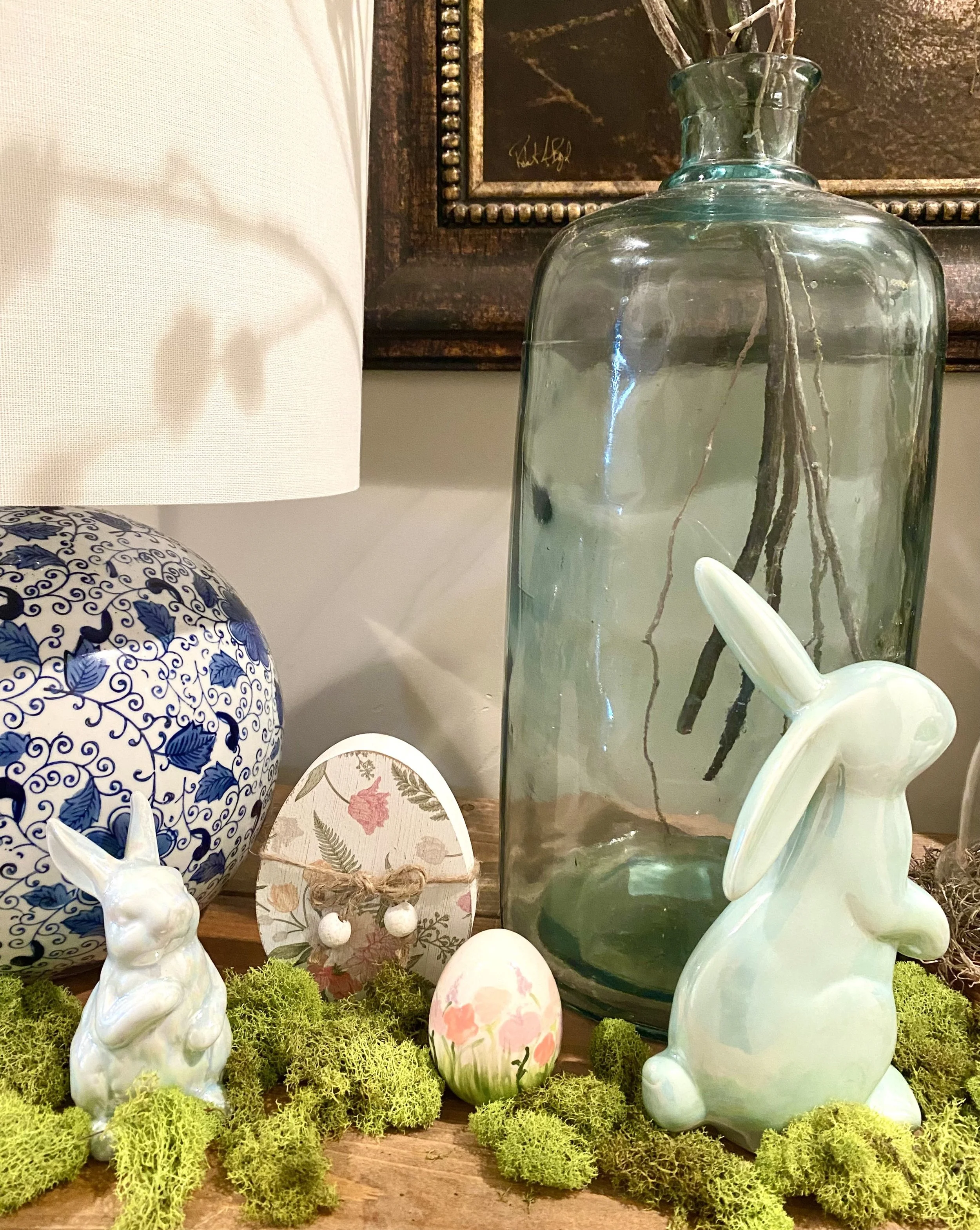 I have a tiered tray that I absolutely love! I have been charmed by them since they got popular and I don’t even care if they are not trending anymore, I still love them and they are a perfect place to coral all the fun and little decorations that I have for each season. Also, see that green moss stuff? I got that a Hob Lob and I love to put it all around to “tie everything together”. It’s very “springy” to me! Love!