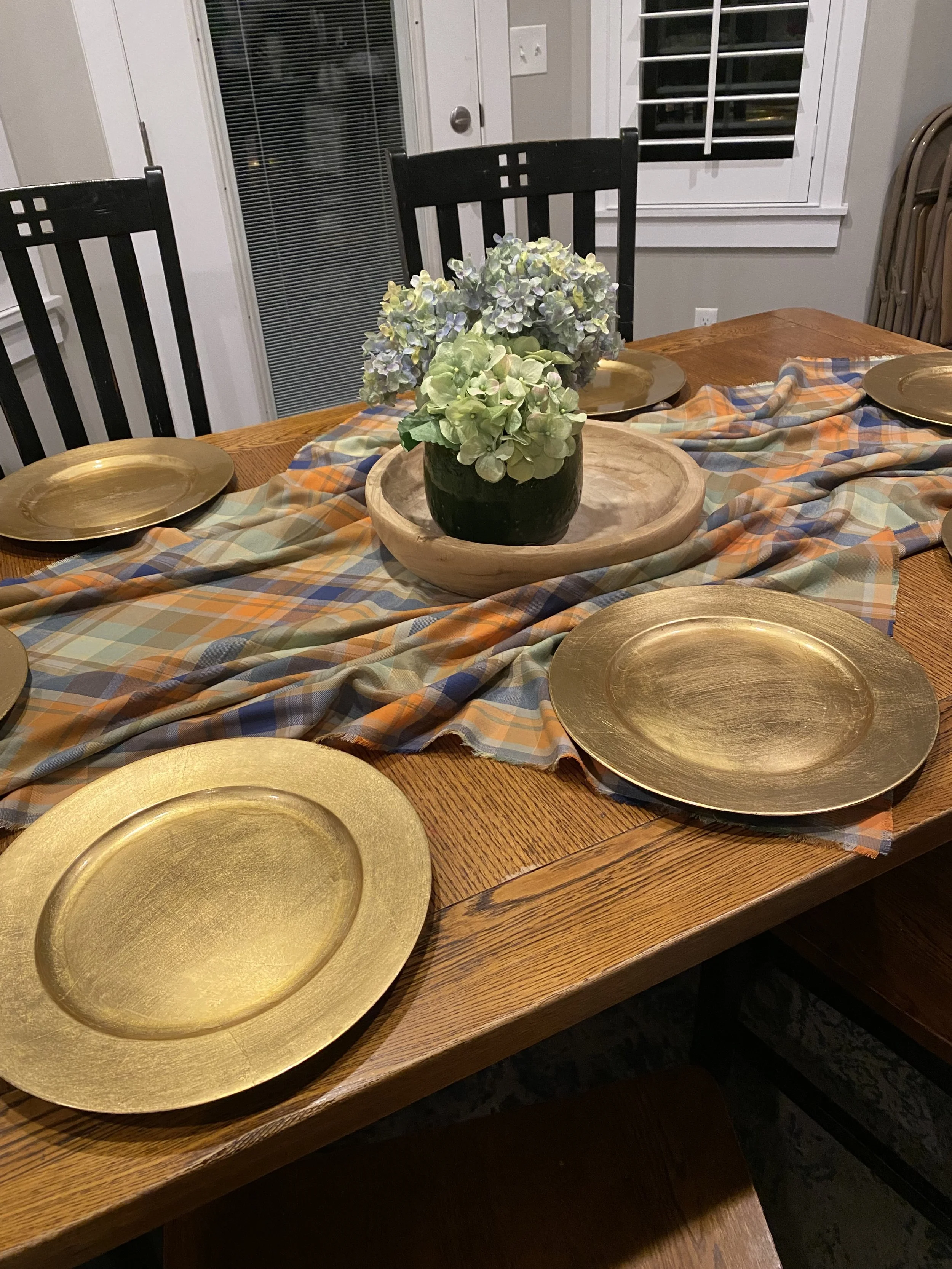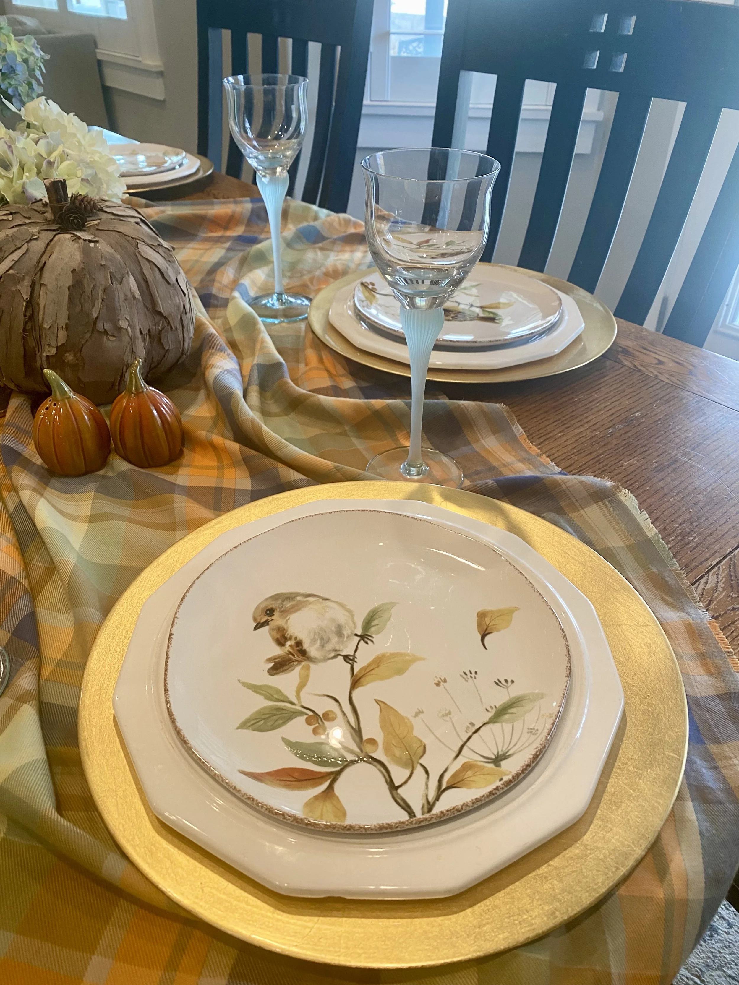You totally don’t have to do this step, but I like a placemat or charger under my plates. I liked the gold color with the fabric, the colors blend well.