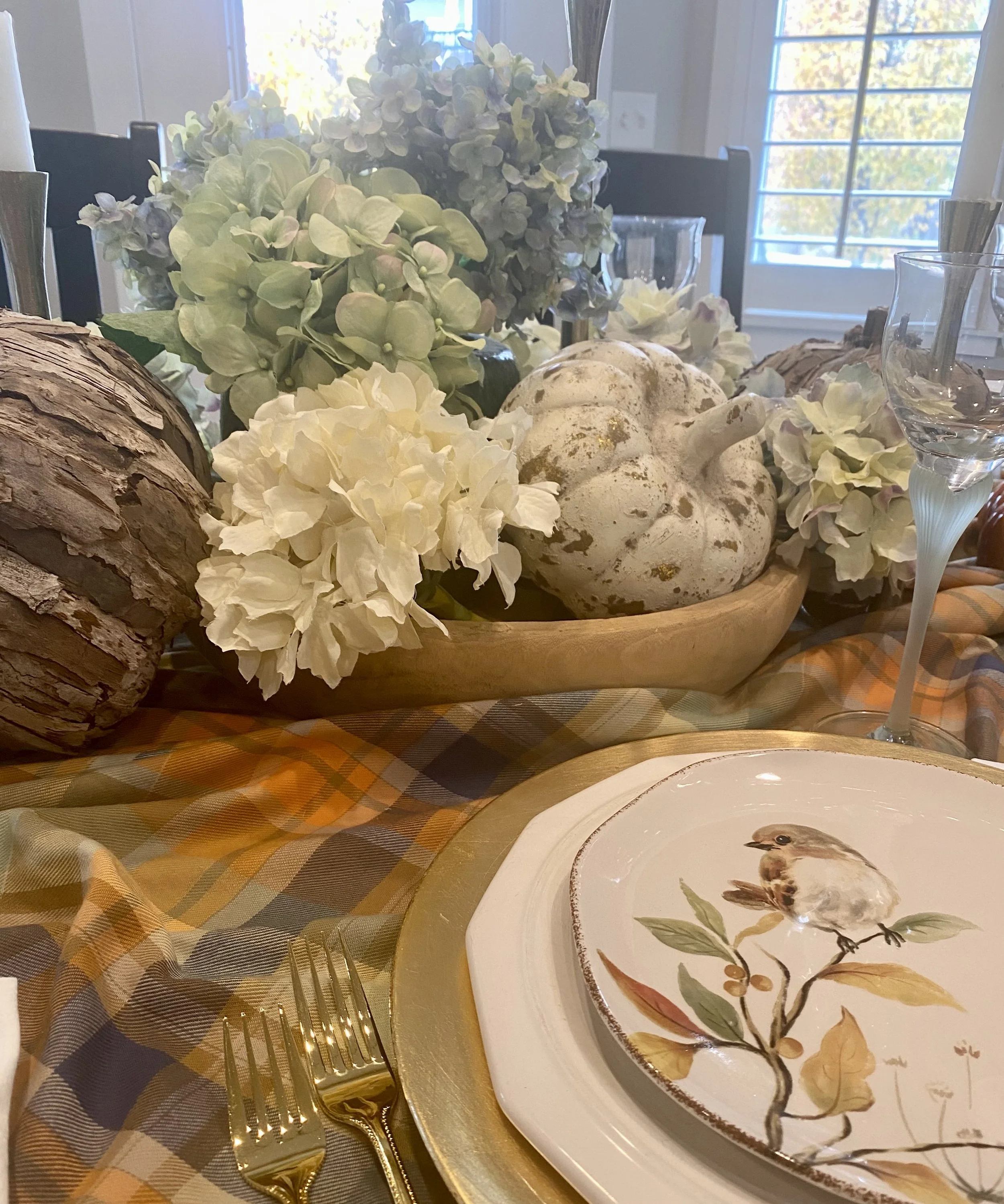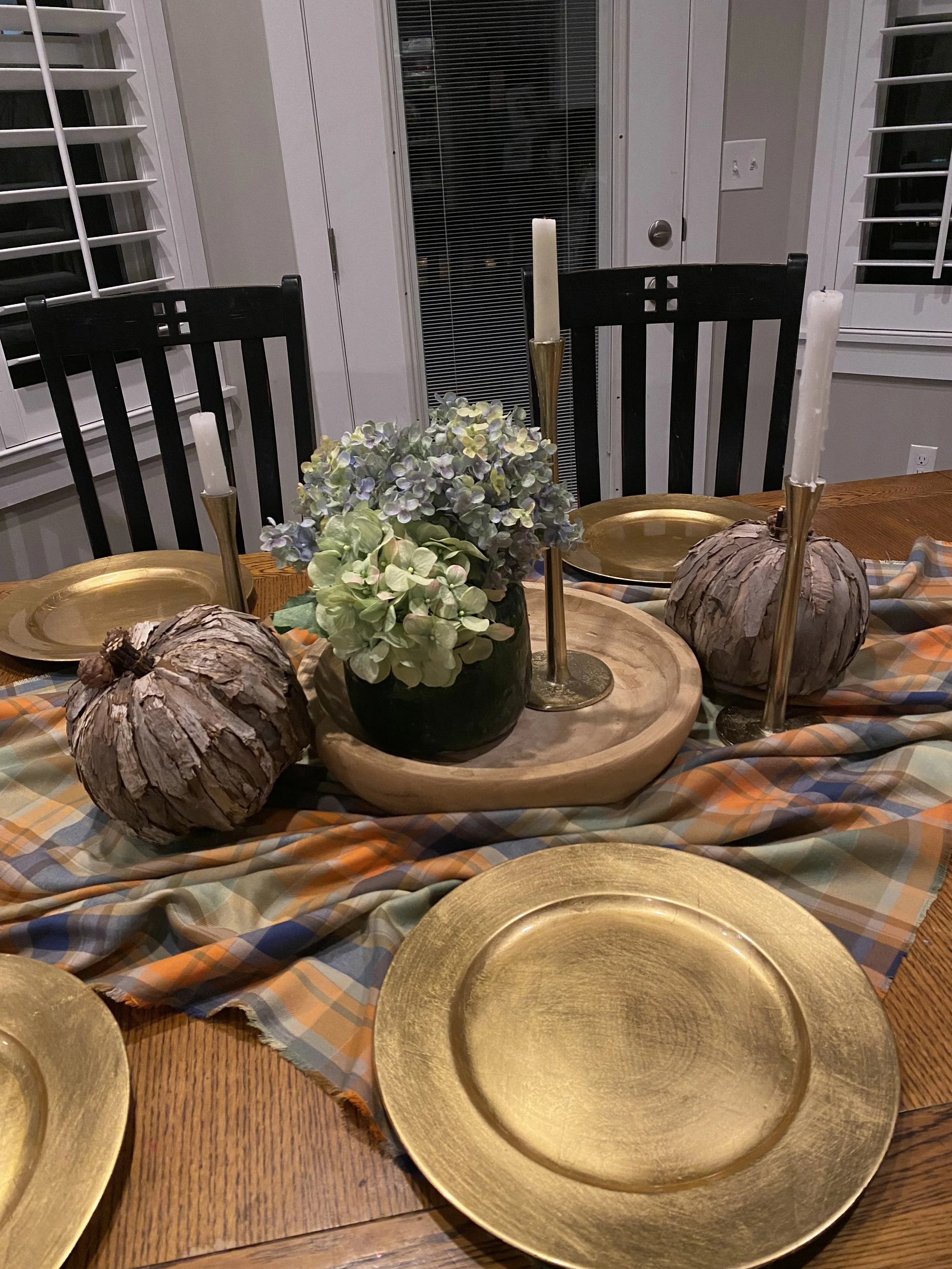 At this point, I start looking around my house, at the fall items I have up, or other stuff I’m storing. I love this wooden bowl with the flannel, and the green pot with hydrangea’s goes well with the color in the fabric. The fabric is going to dictate how this table is styled.