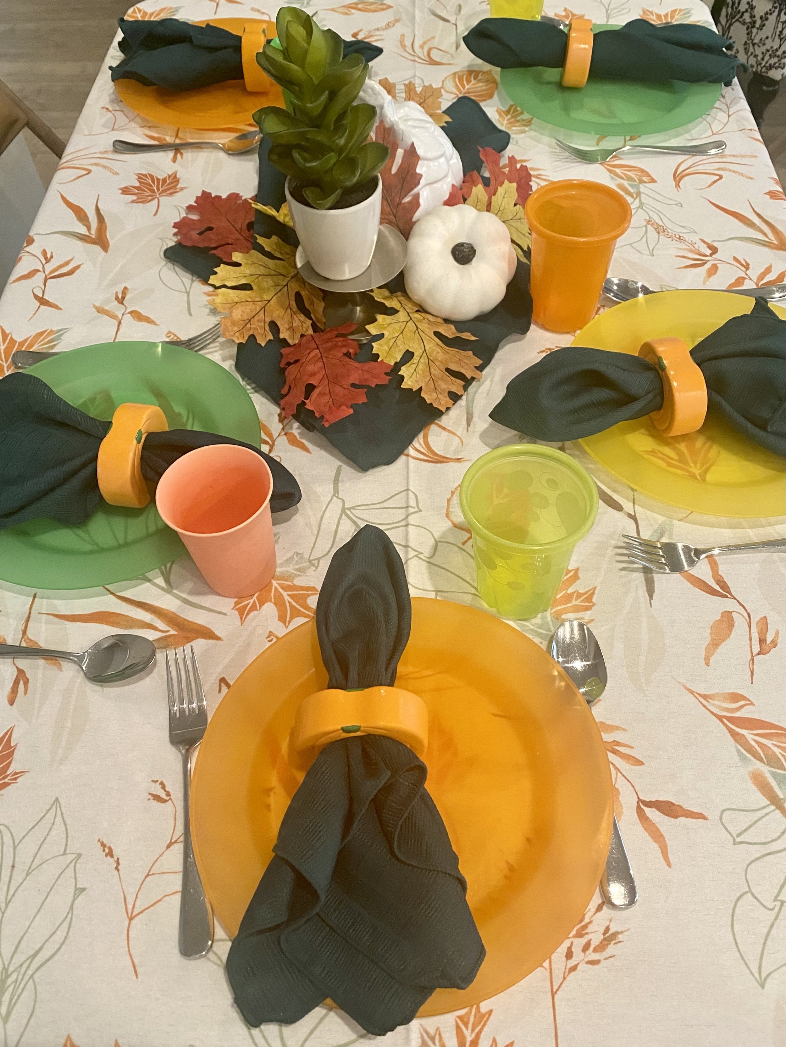 Don’t forget the kids table! We have littles and as much as I love them I don’t want them using my light blue crystal goblets, lol (they are ages 4 - 9), and they don’t care how the table is set, they just want a place too! (Plates and cups from the dollar store.)