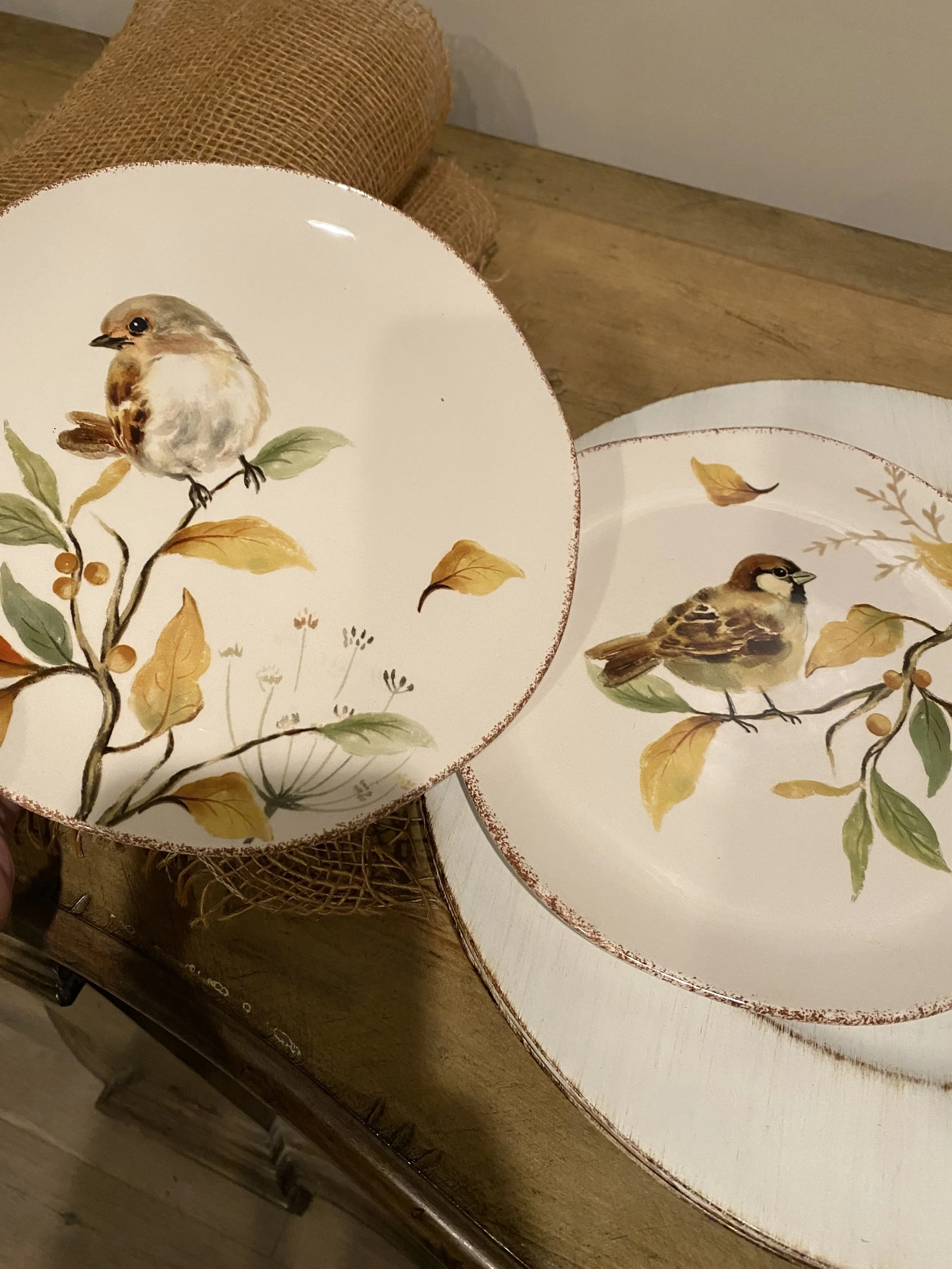 I was hoping to use these stinking cute bird salad plates that I got from Hobby Lobby last year after Thanksgiving. I have basic white plates that I use a lot, and then I just stack the salad or dessert plates on top to bougie it up a bit! That way I don’t have to store a bunch of big dinner plates. But I do have stacks of salad plates stashed all over my kitchen (the hubs hates it, lol) When I bought the fabric, I forgot I had these plates, I’m so glad the colors worked with the fabric.