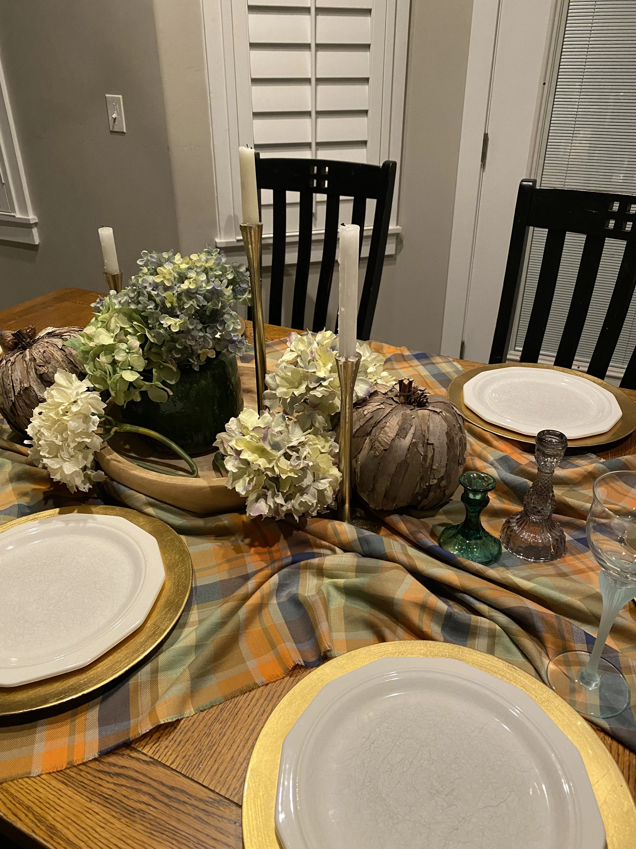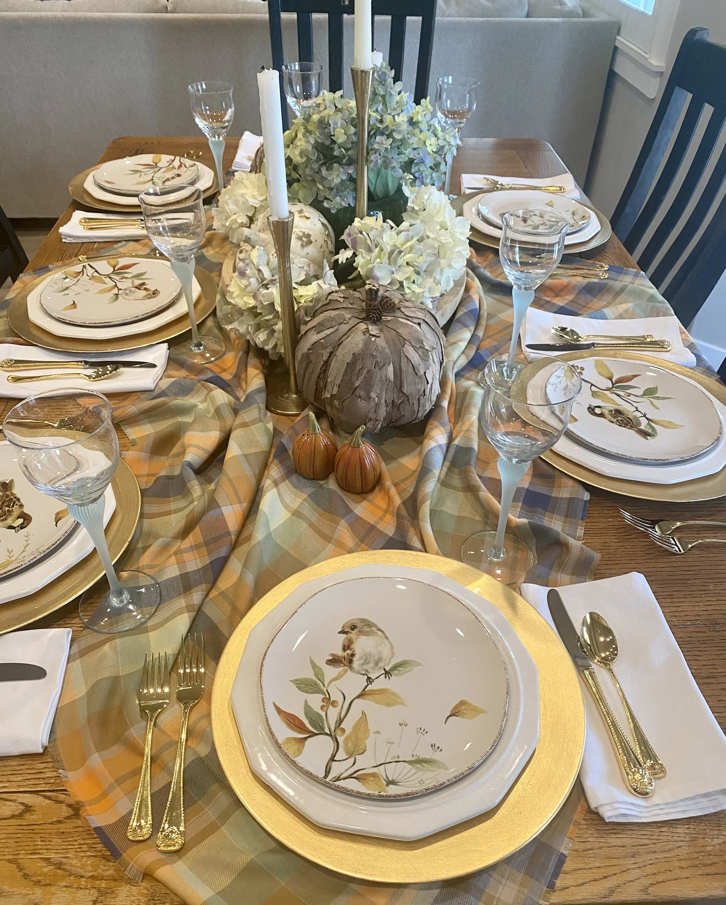 Here the basic white plates are on the chargers and I’m still deciding on the centerpiece. Also, I got out these beautiful light blue goblets I got when I was married a hundred years ago. I stored them for years in my basement (so they could stay safe and protected), finally I decided it’s better to use them, and chance them getting broken, to just sitting in a box! The color isn’t perfect for this, but blends in enough AND I love them. Also, I was seeing if I liked the green or gray candlesticks with the fabric, which I don’t, so back in the cupboard they go!