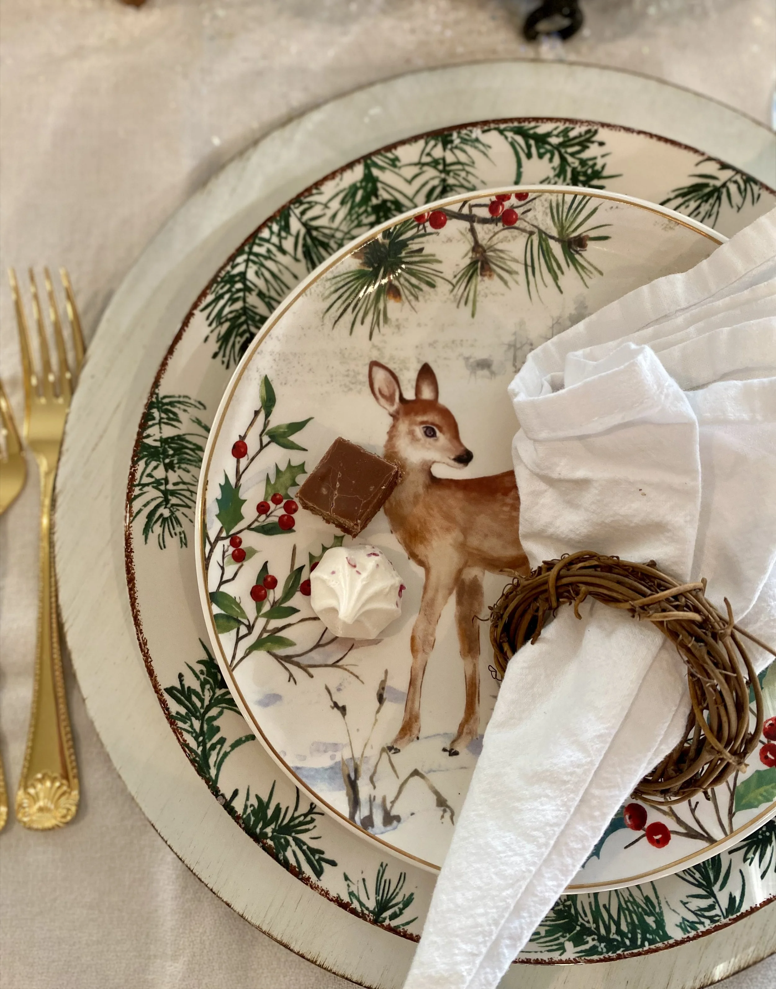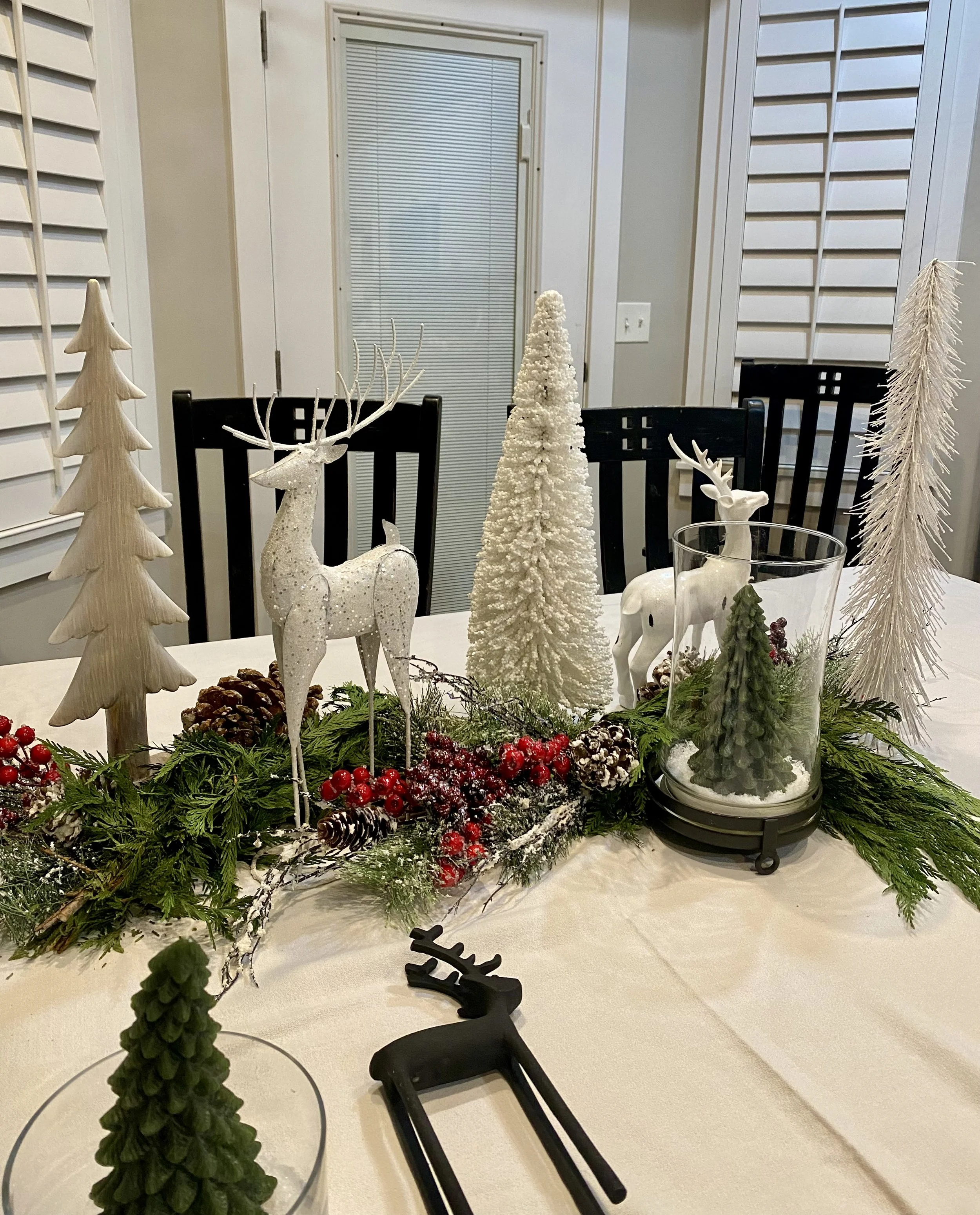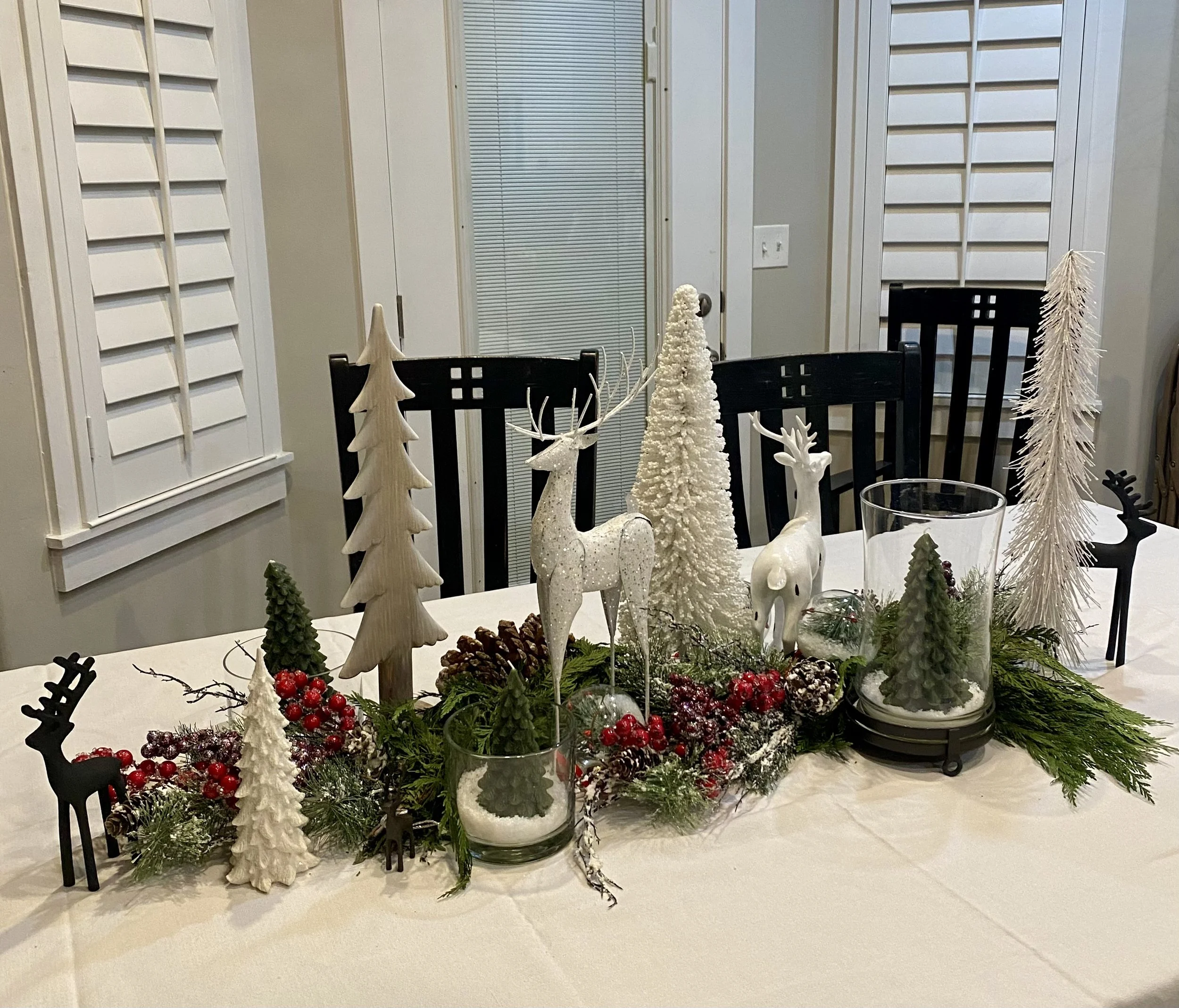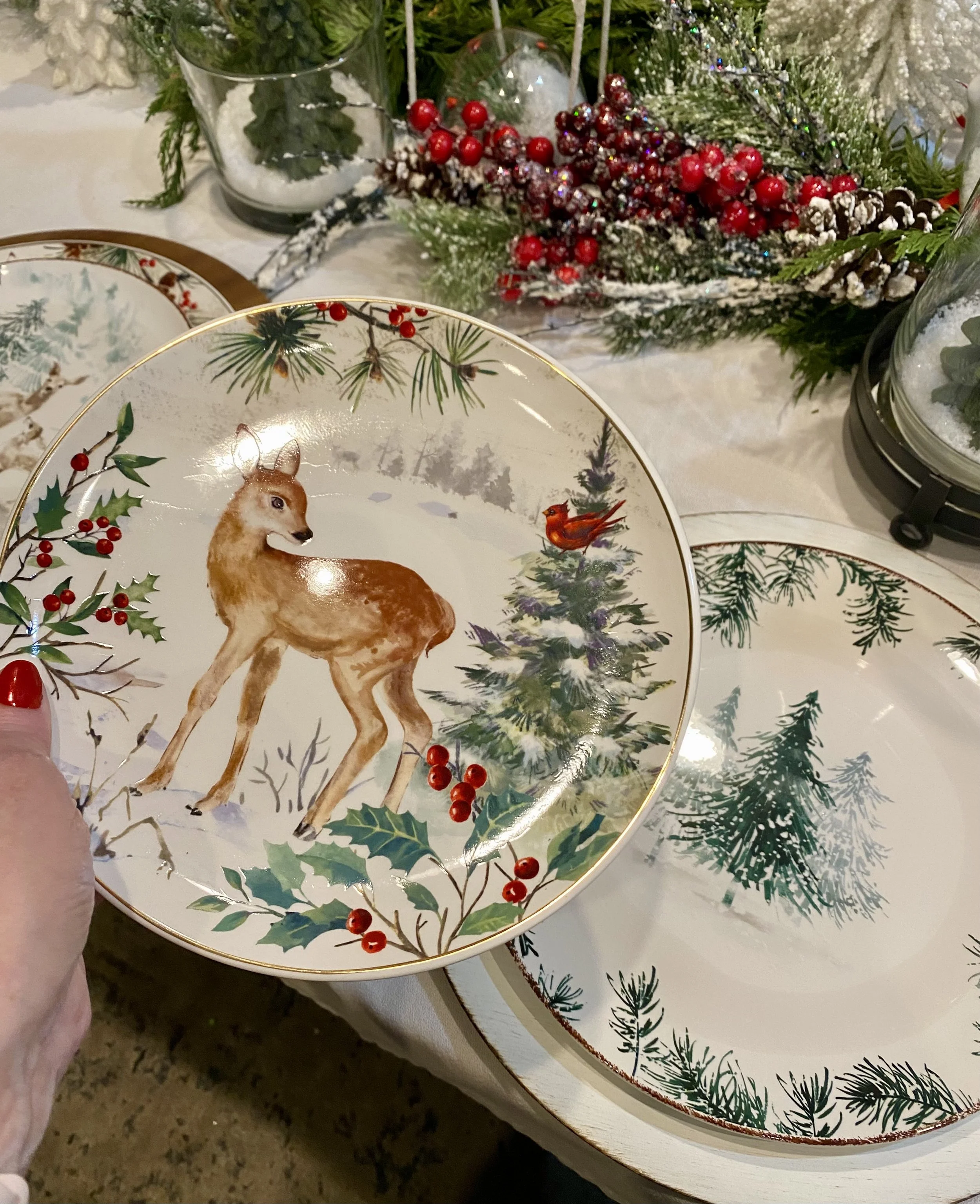 We’ll need some trees, forest greens, snow and deer, she thought. She grabbed items from her mantle, from her entry table and from all around the house until she found enough stuff for those cute lil’ deer plates to live by.